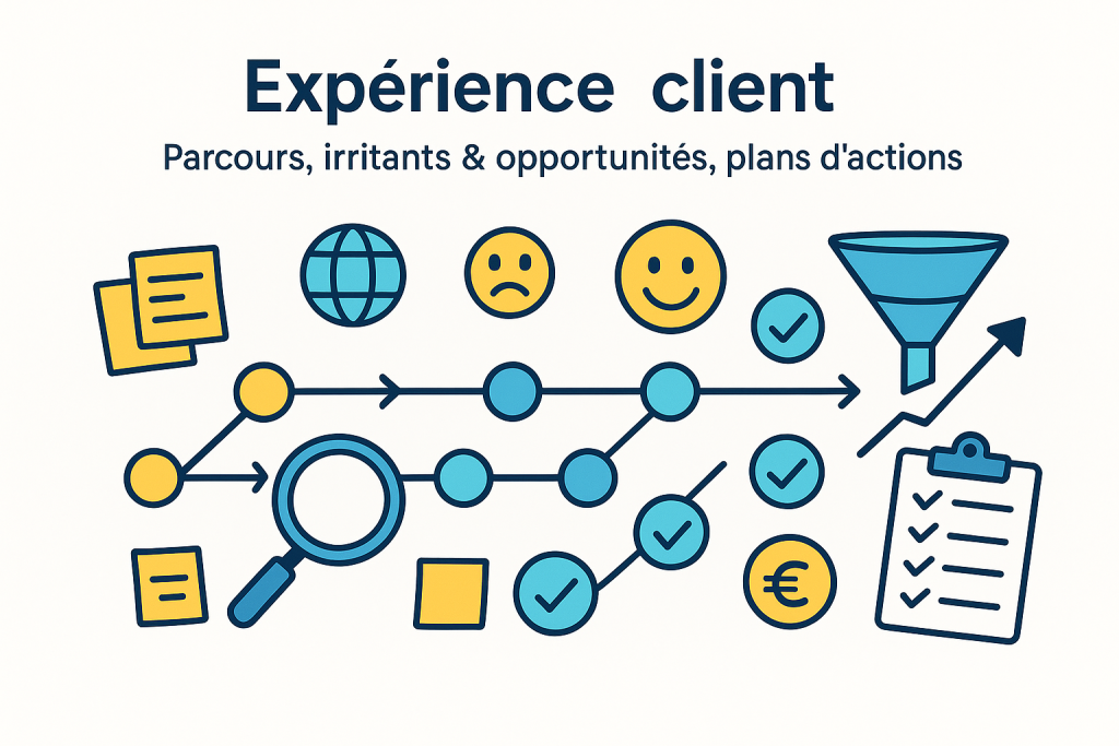 Cartographie des parcours, diagnostics irritants/opportunités, plans d’actions pragmatiques orientés performance commerciale.